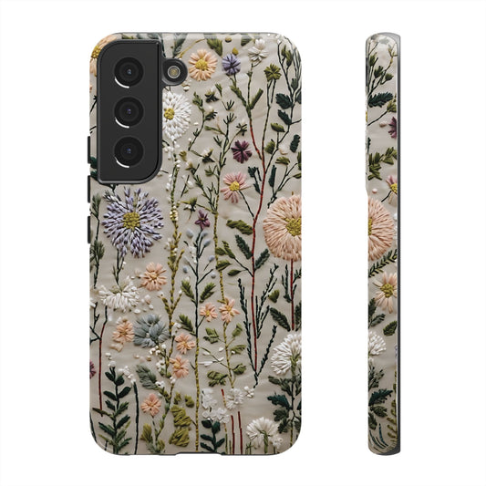 Intricate Embroidery Artwork Featuring Botanical Elements On Beige phone case design.