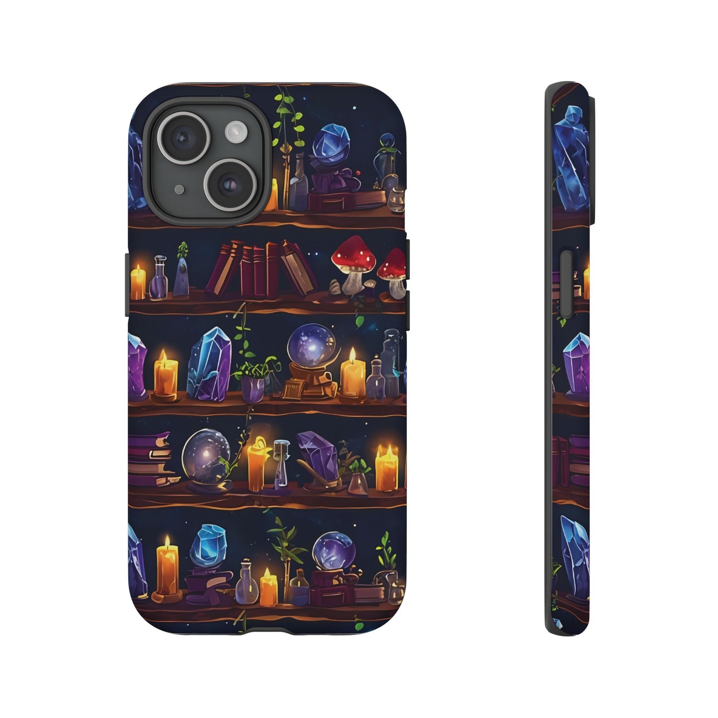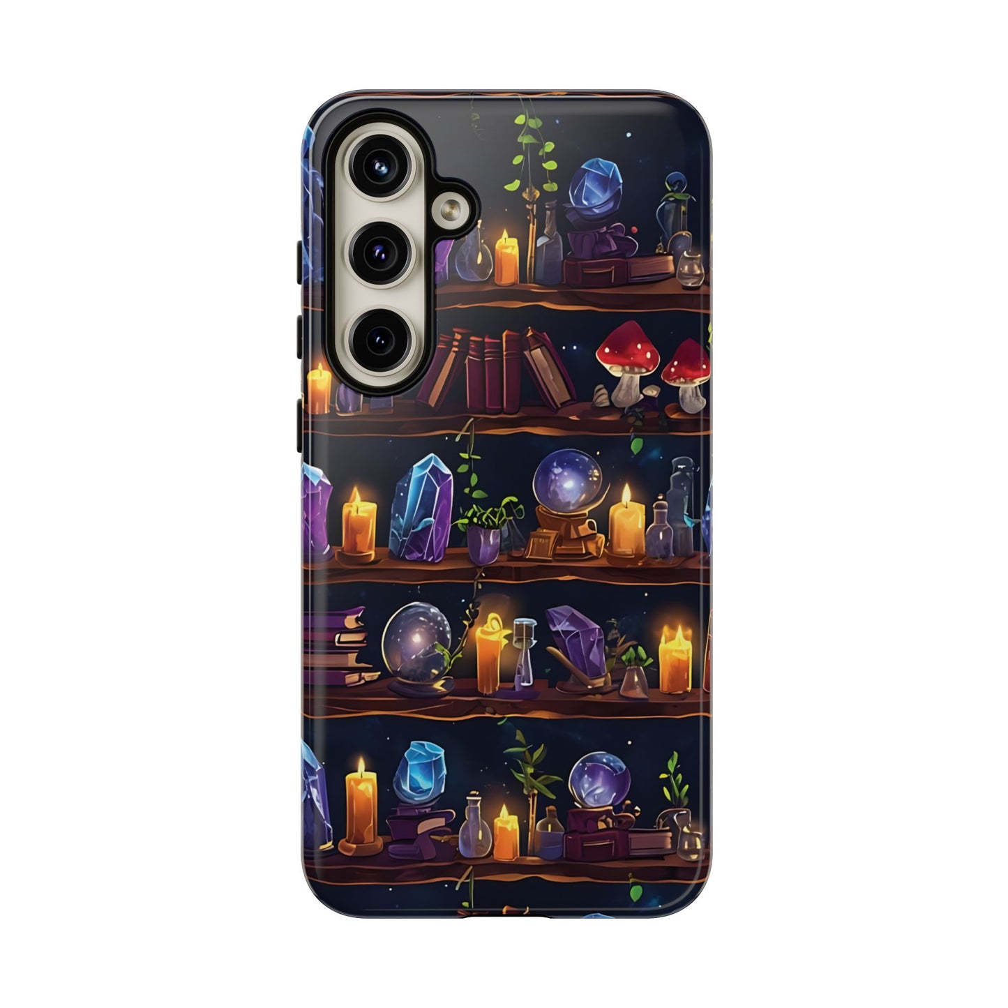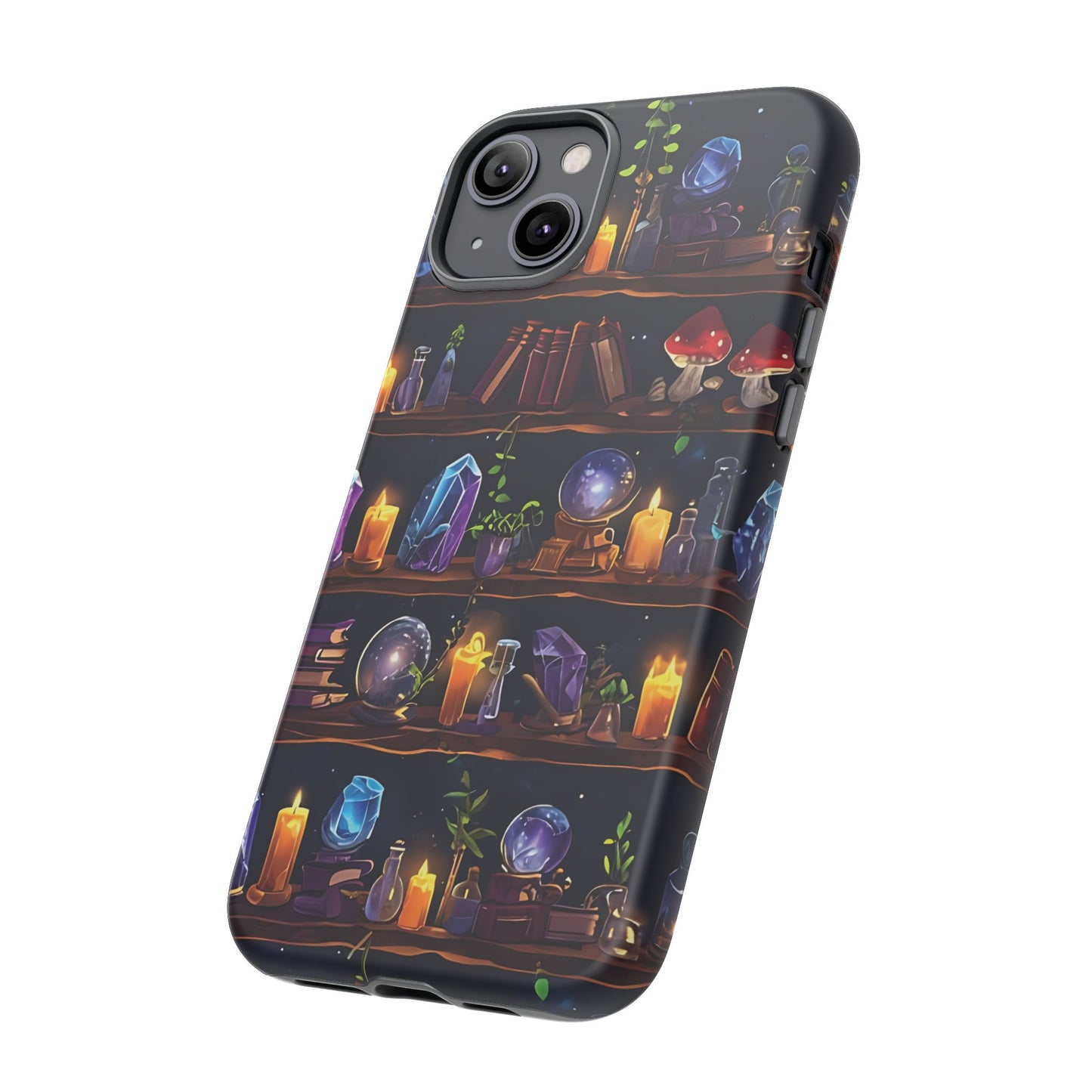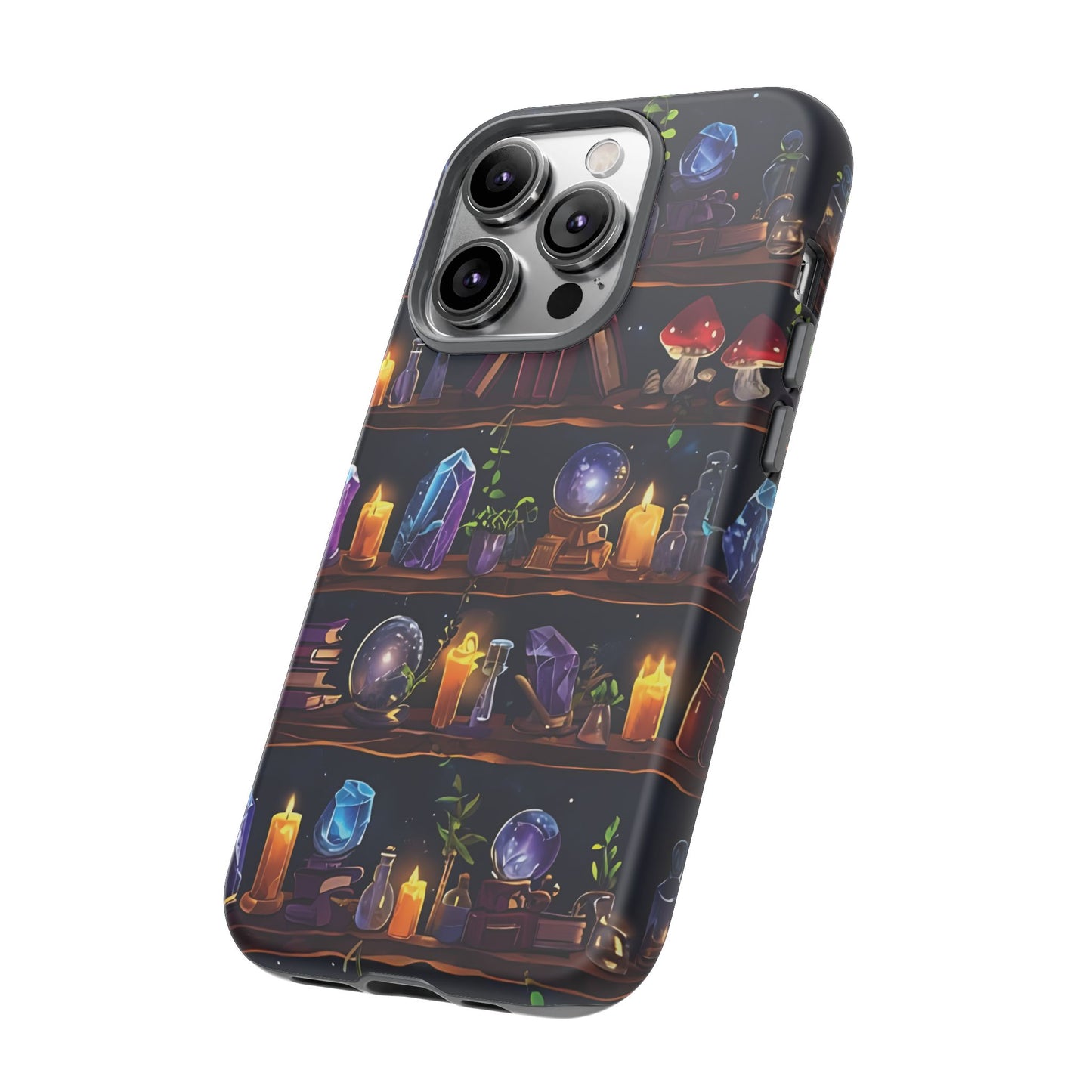 Step into a world of enchantment with this captivating phone case featuring a seamless pattern of wooden shelves filled with mystical items. The intricate design showcases spell books, potion bottles, glowing crystals,