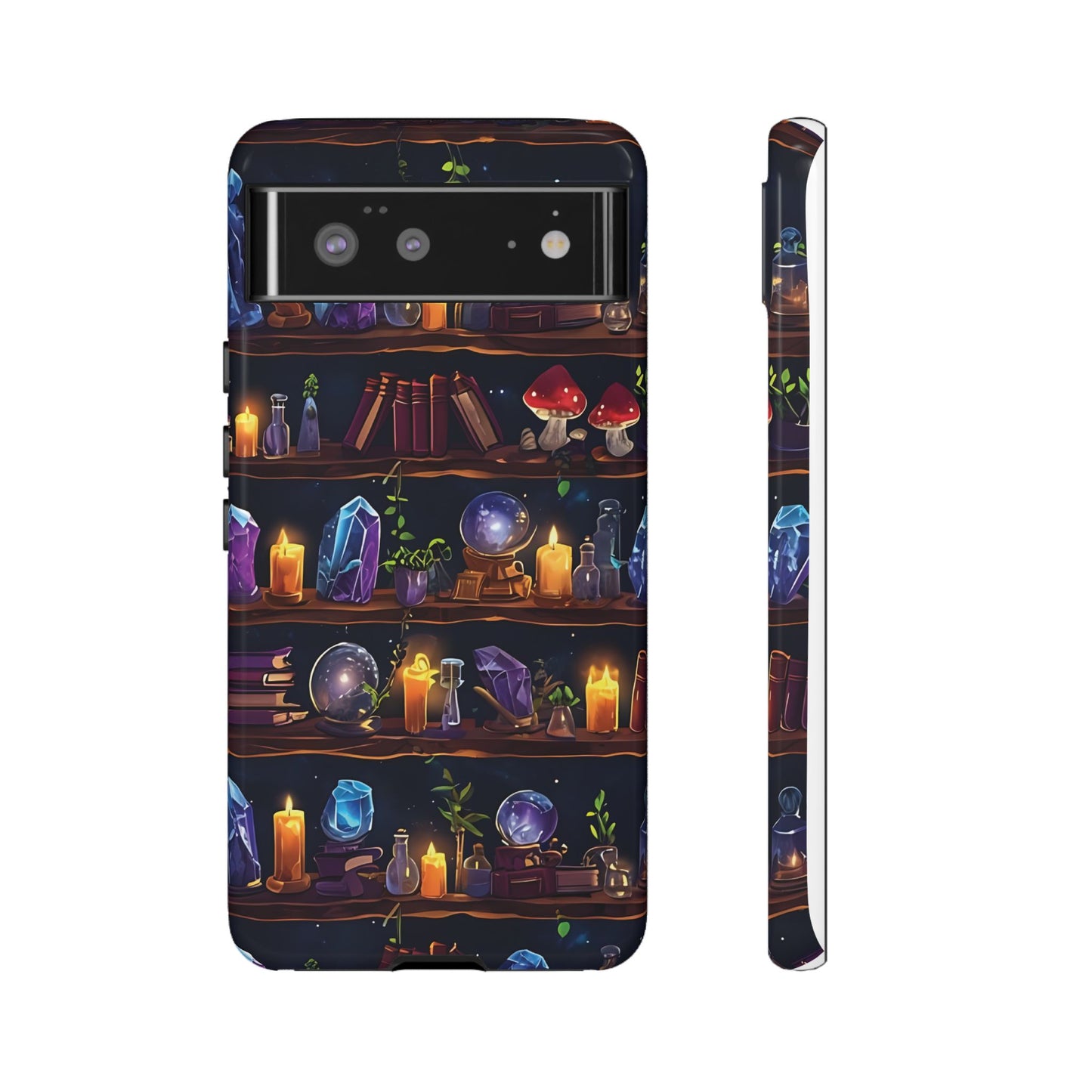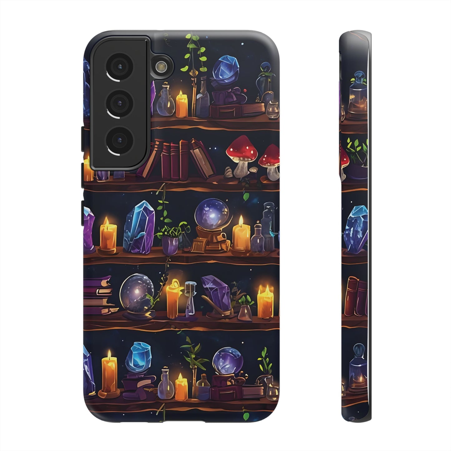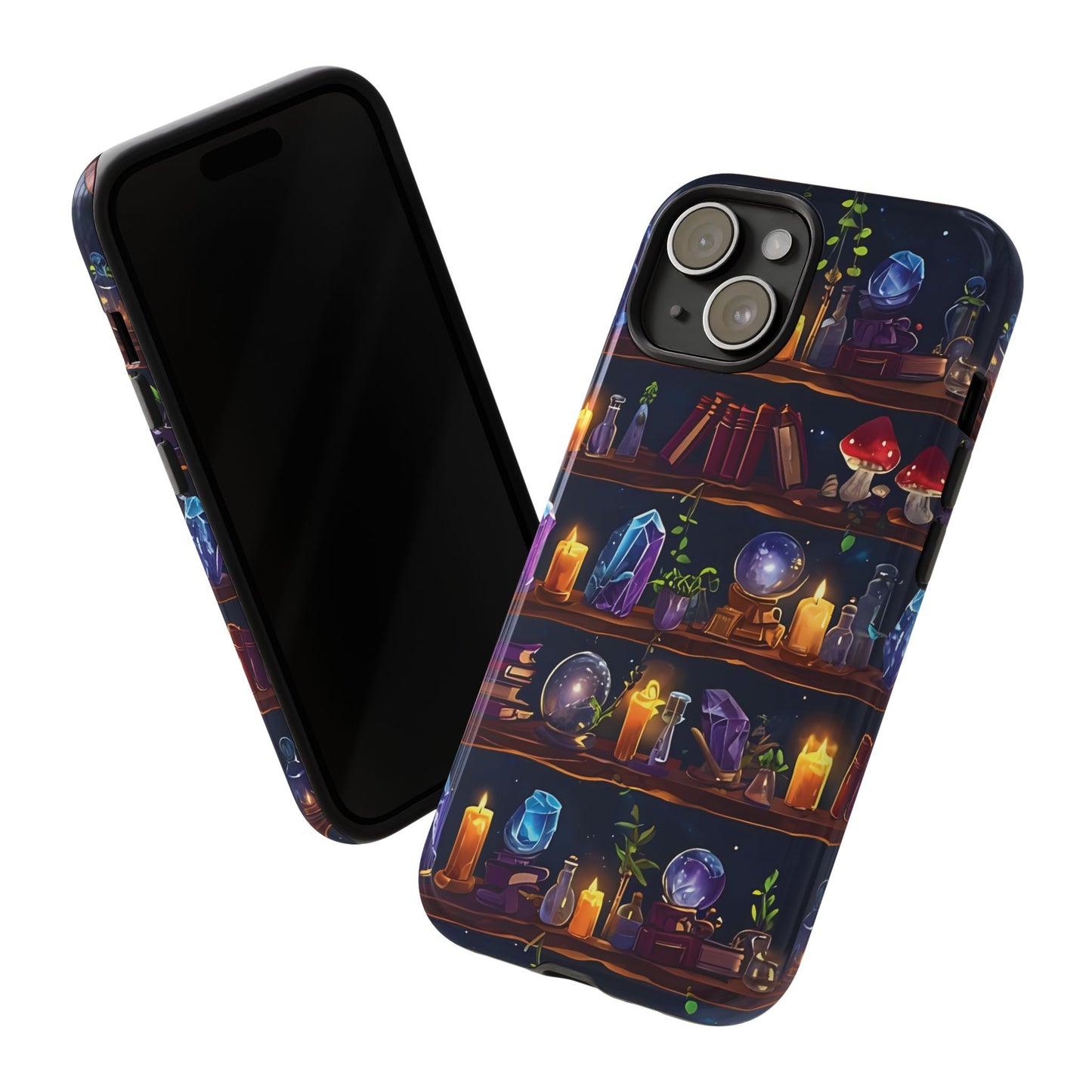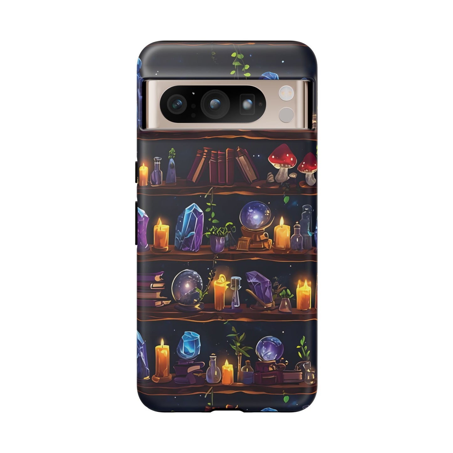 Step into a world of enchantment with this captivating phone case featuring a seamless pattern of wooden shelves filled with mystical items. The intricate design showcases spell books, potion bottles, glowing crystals,