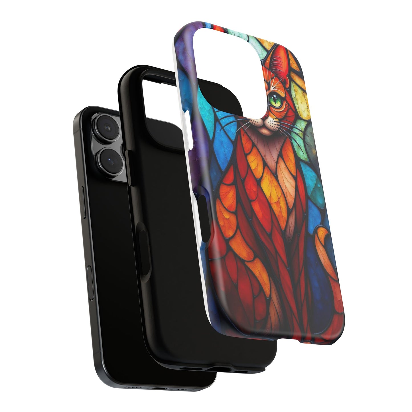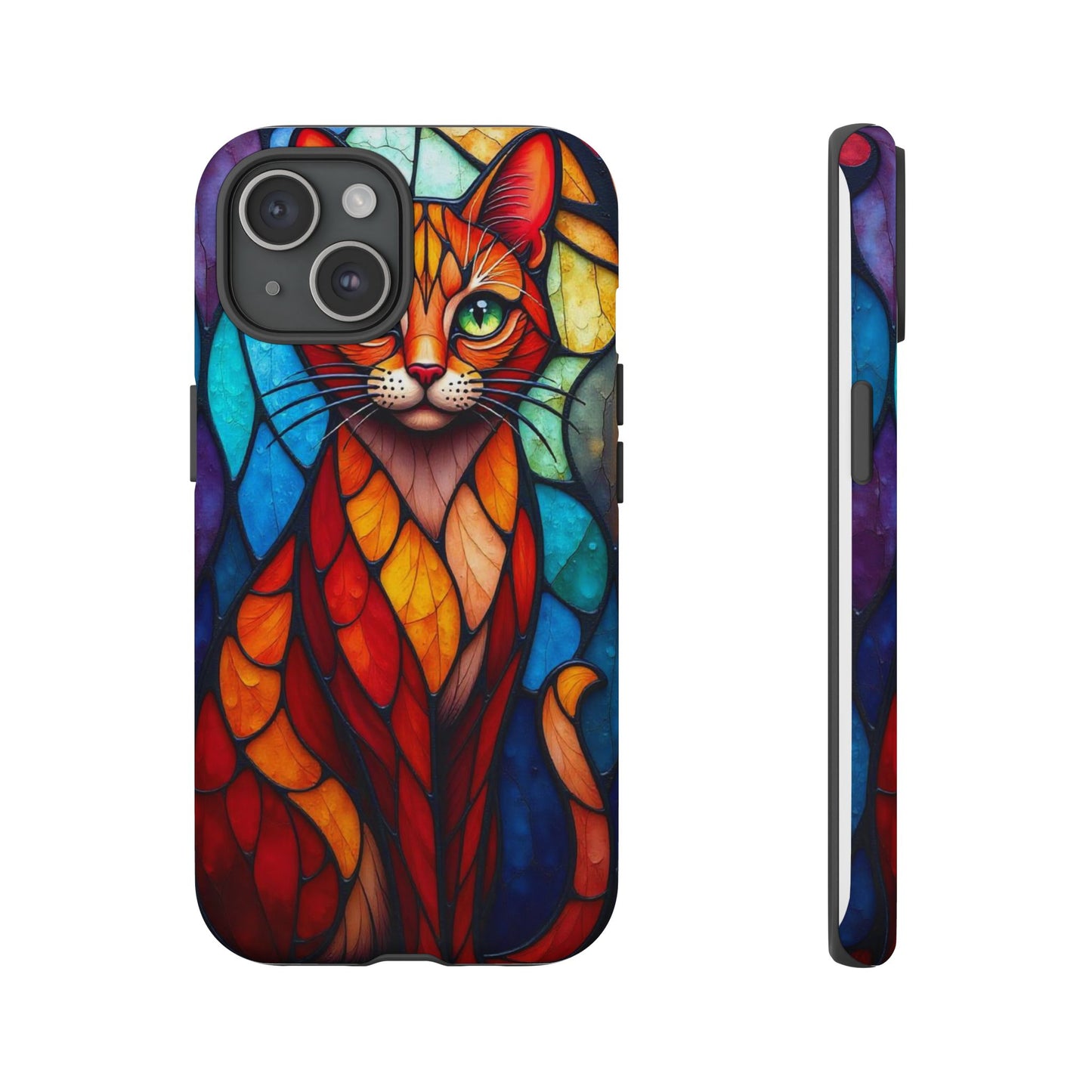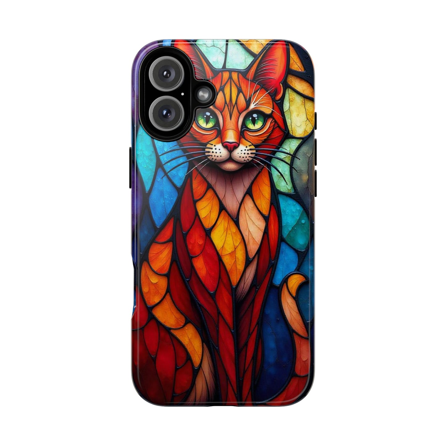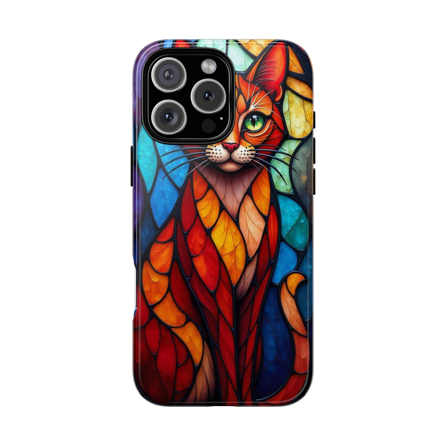 A captivating abstract portrait of a cat, featuring vibrant geometric patterns in orange, red, blue, and green. The cat's large, expressive green eyes and detailed, textured face make this design a bold, artistic addition to your mobile case.