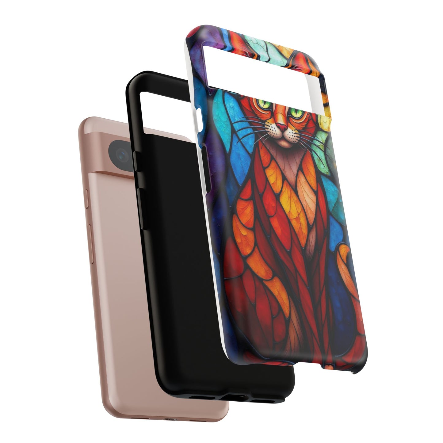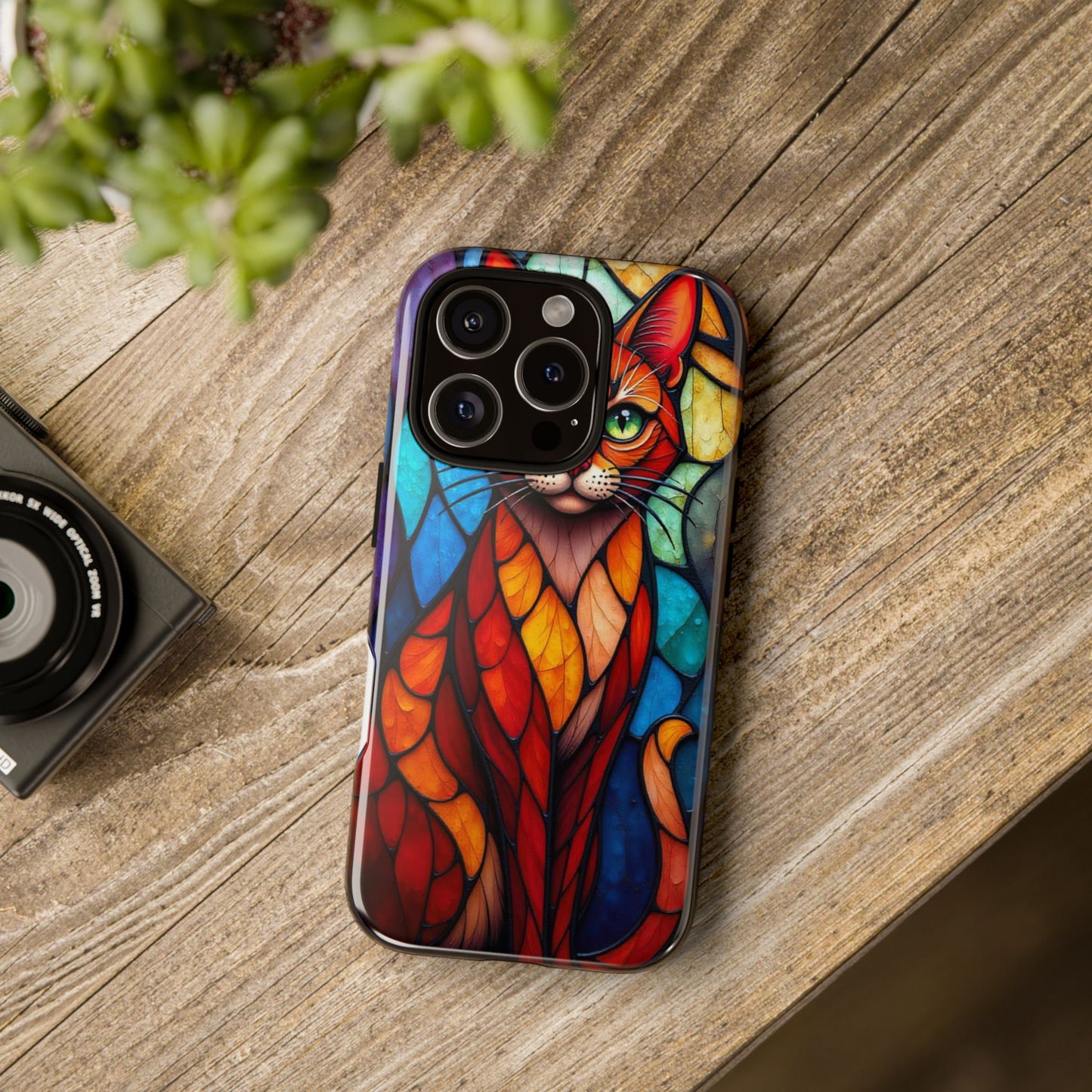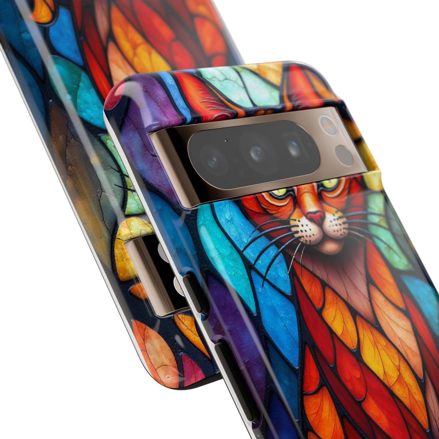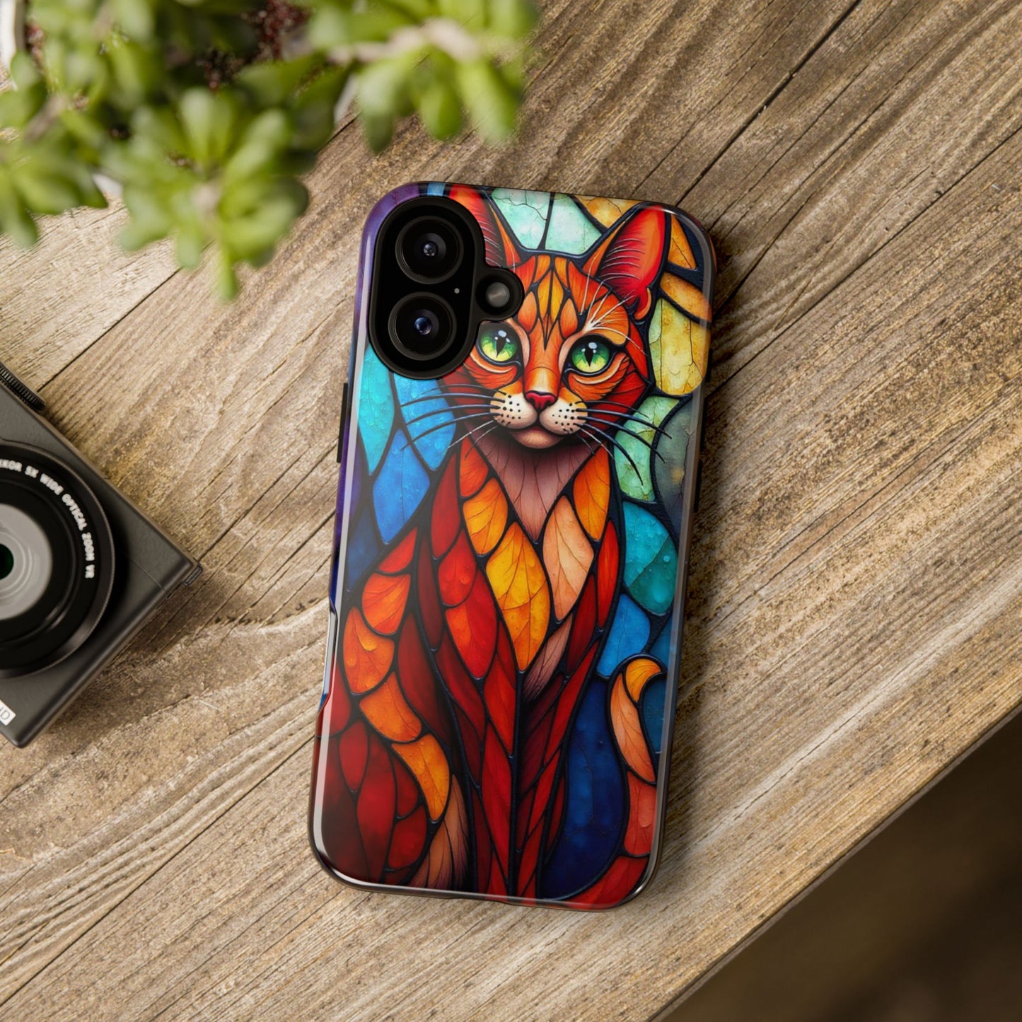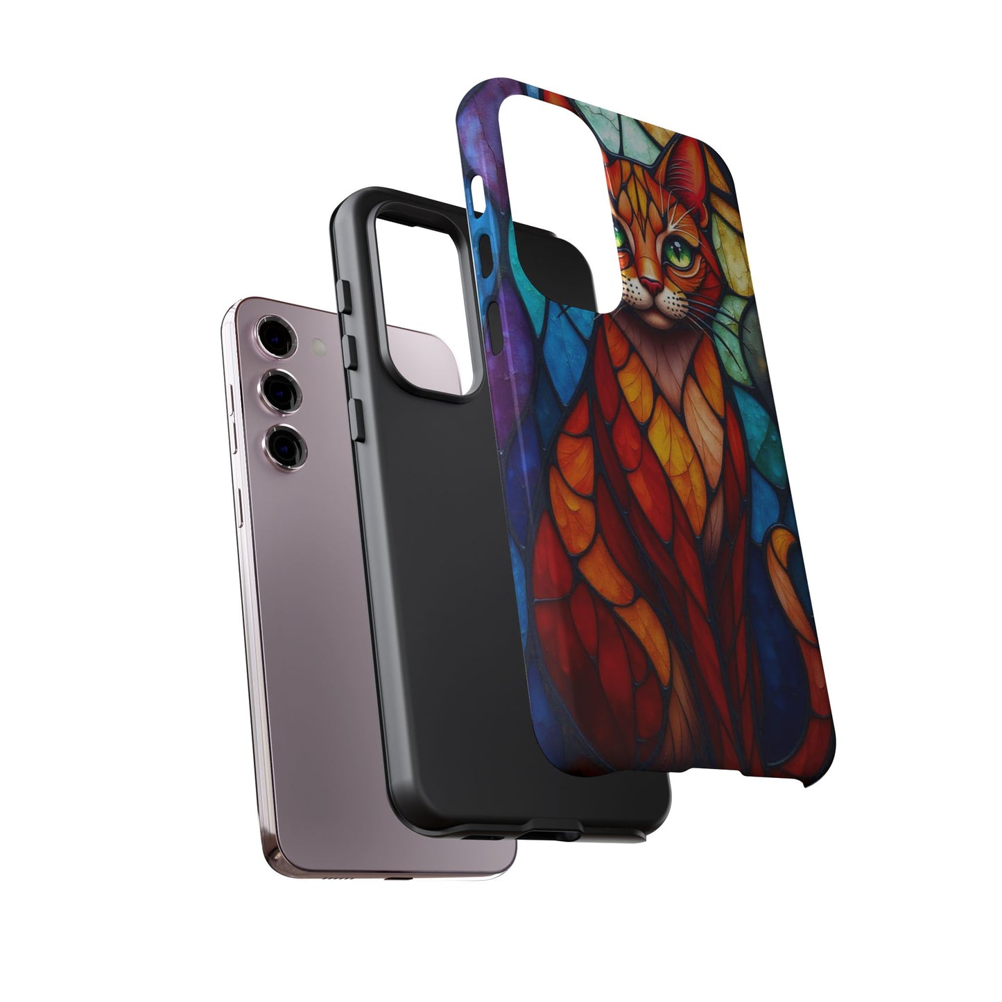 A captivating abstract portrait of a cat, featuring vibrant geometric patterns in orange, red, blue, and green. The cat's large, expressive green eyes and detailed, textured face make this design a bold, artistic addition to your mobile case.