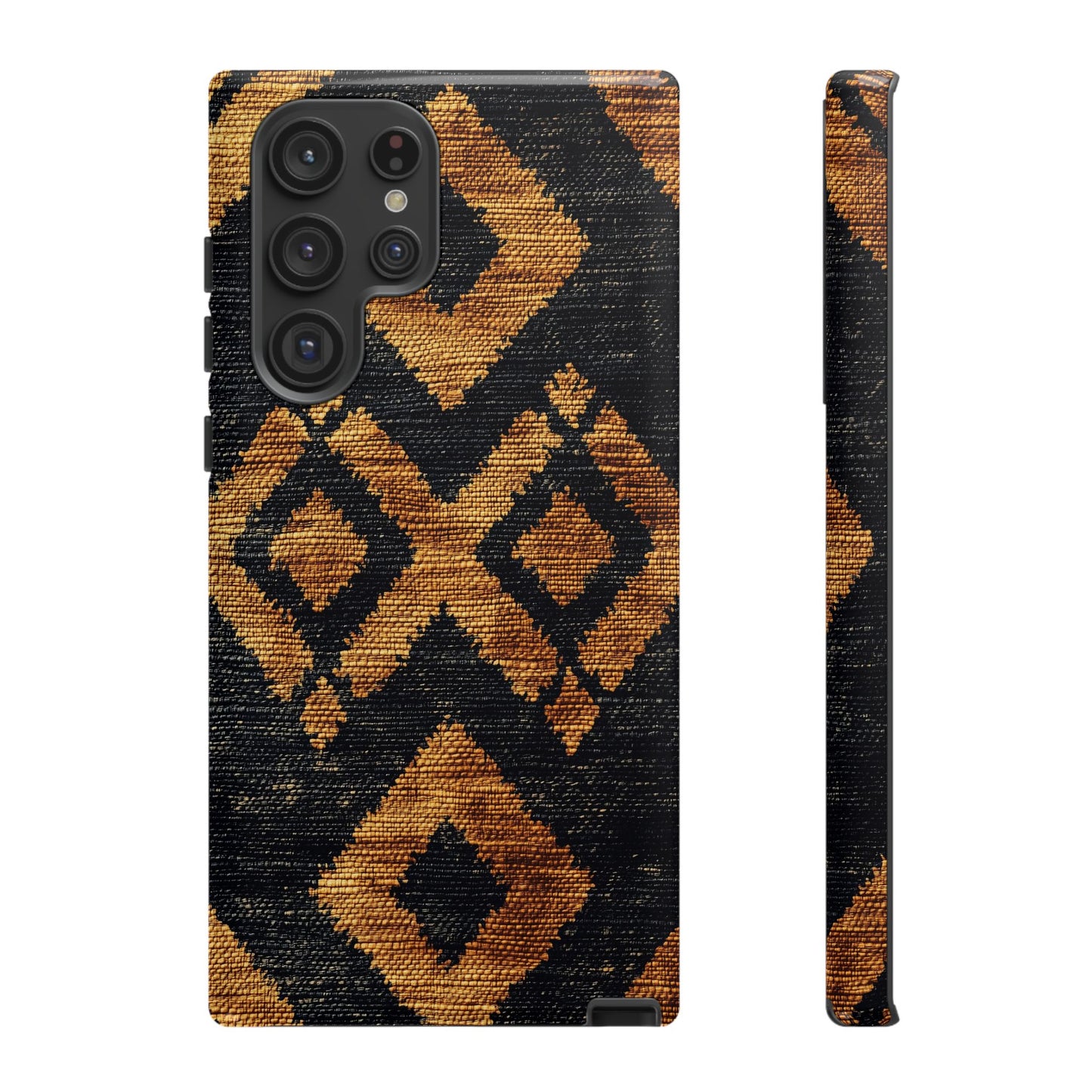 Embrace earthy vibes with this Boho phone case featuring a bold golden tribal pattern on a deep woven texture. Perfect for iPhone, Google Pixel, and Samsung, this design brings warmth, style, and a touch of wanderlust to your everyday look.