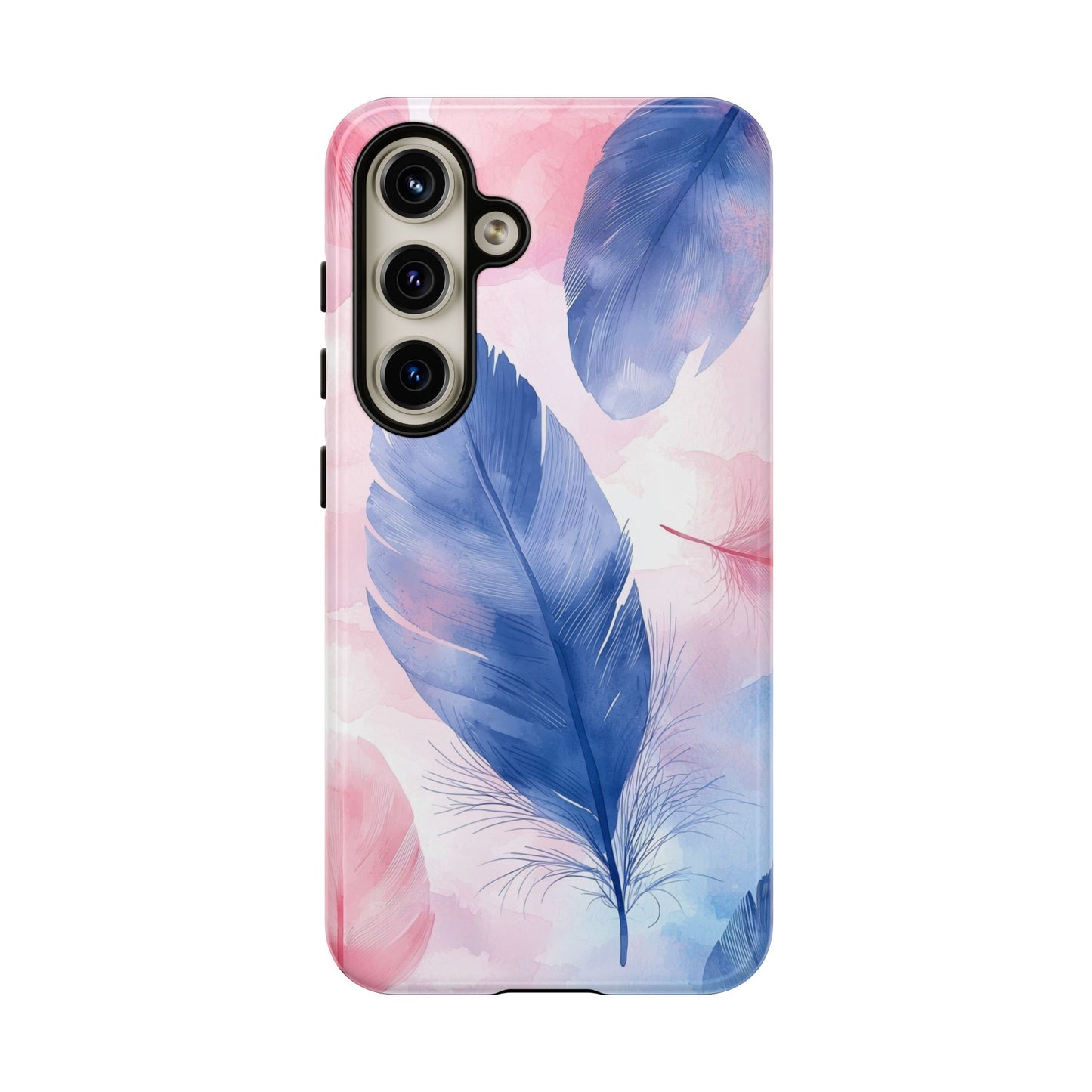 Wrap your phone in delicate charm with floating blue and pink feathers on a dreamy, watercolor canvas.