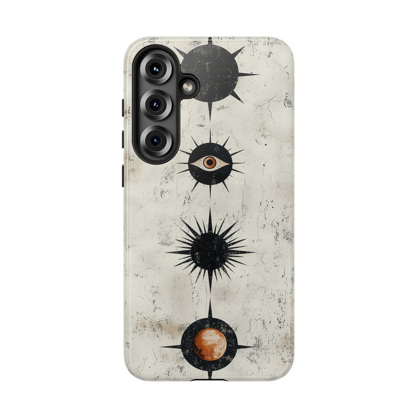 Embrace the power of cosmic symmetry with this striking boho phone case. Featuring celestial bodies, a central all-seeing eye, and textured vintage tones, it's the perfect balance of mystic and minimal. Made for iPhone, Google Pixel, and Samsung.