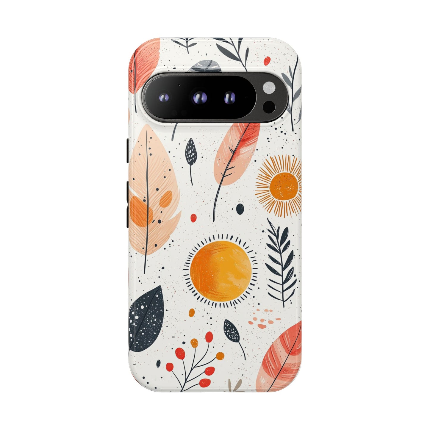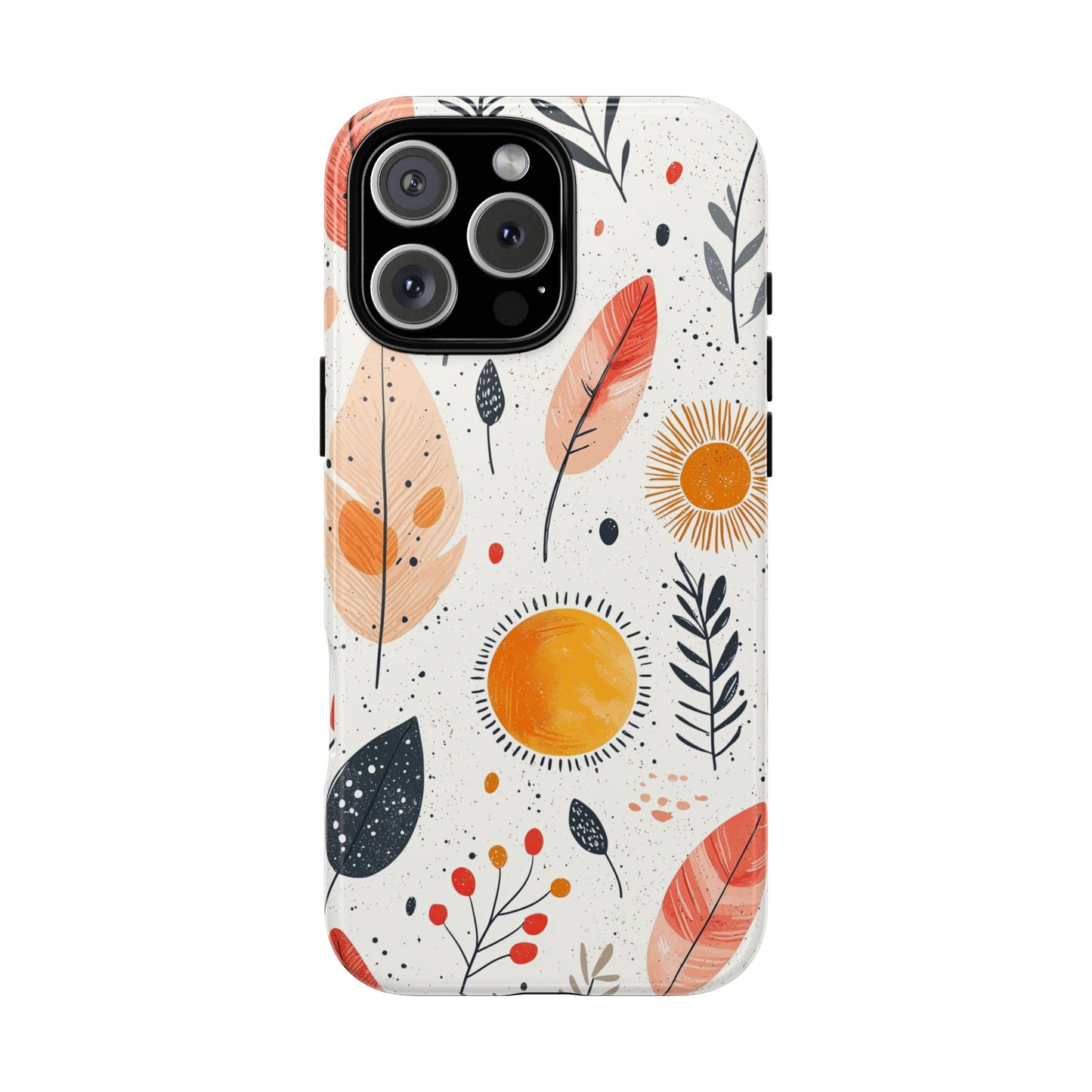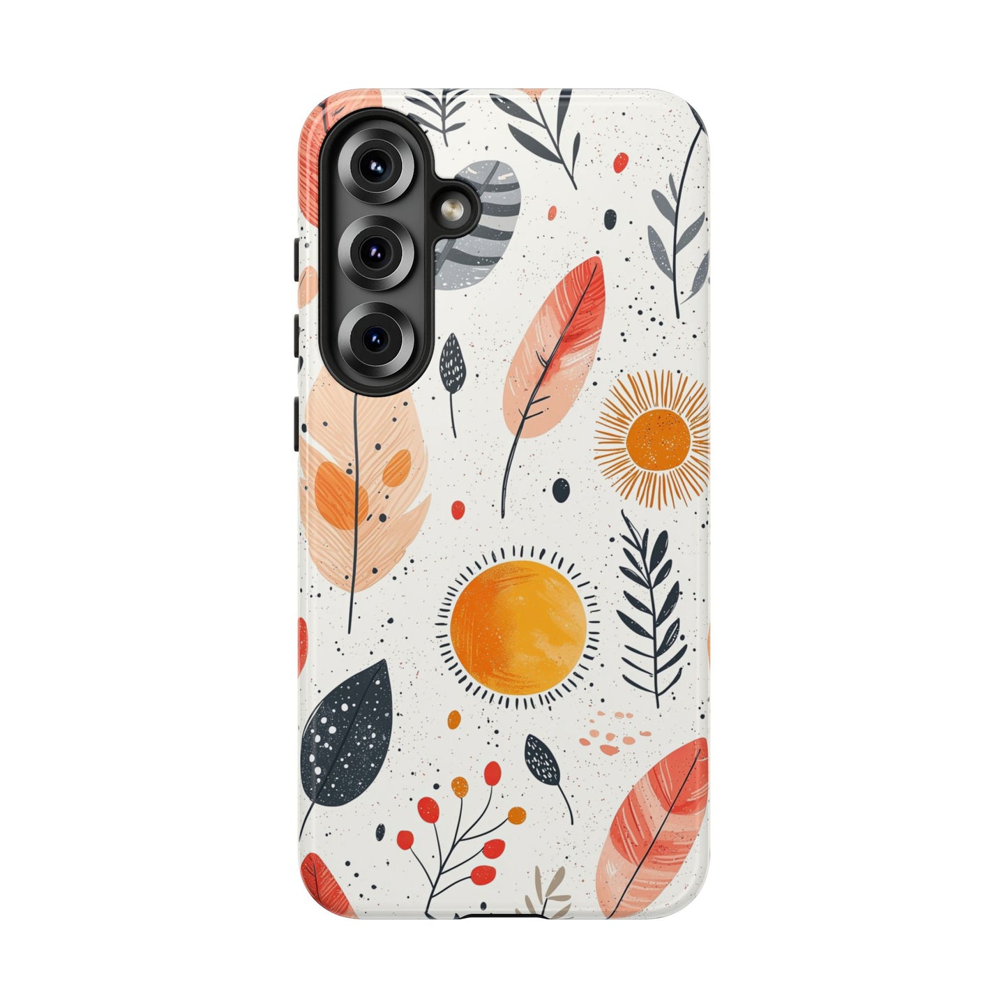 Bring playful warmth to your day with this vibrant boho phone case. Featuring hand-drawn feathers, leaves, and radiant suns in earthy tones, it's a perfect mix of nature and whimsy. Fits iPhone, Google Pixel, and Samsung devices.