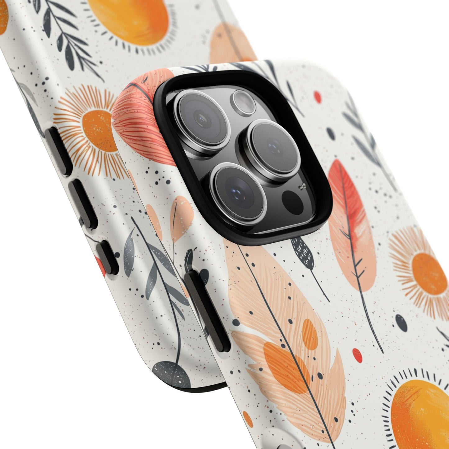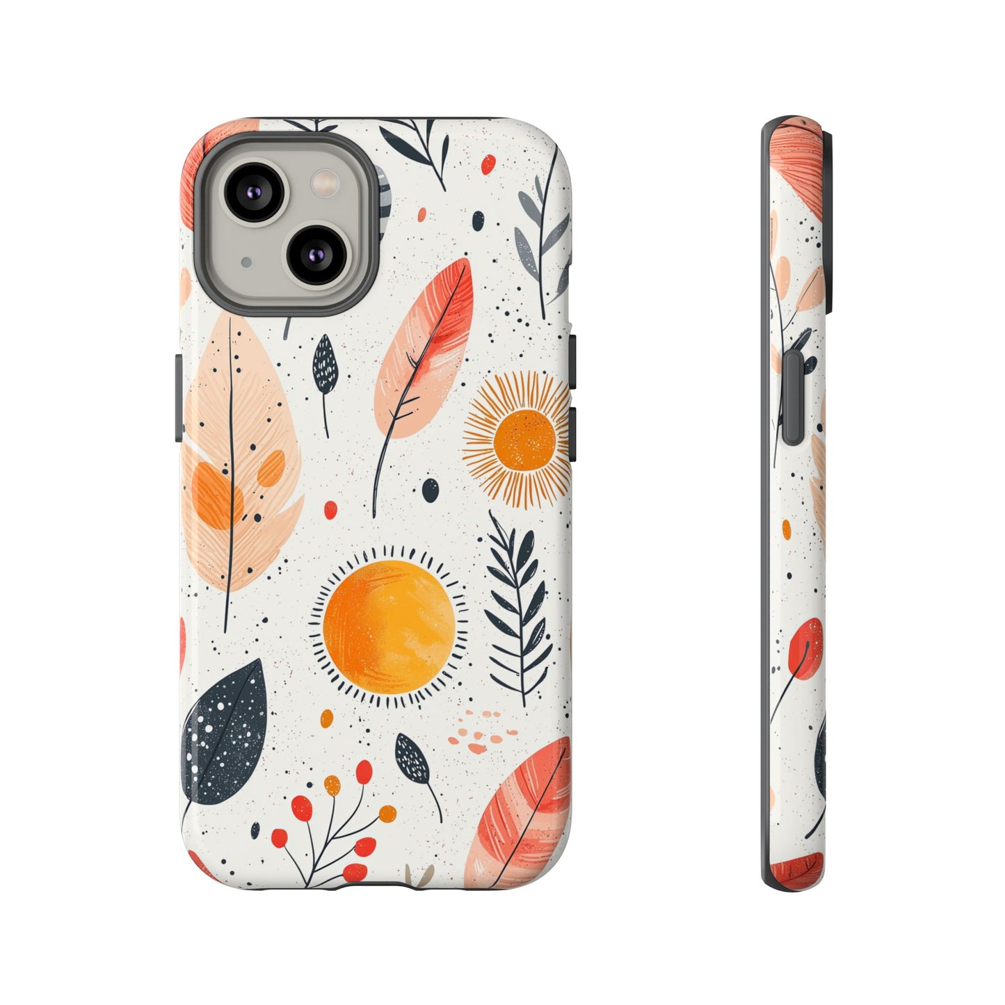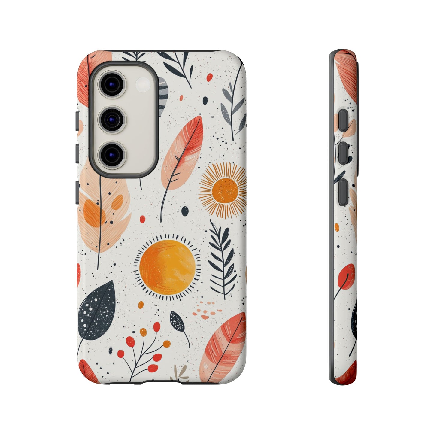 Bring playful warmth to your day with this vibrant boho phone case. Featuring hand-drawn feathers, leaves, and radiant suns in earthy tones, it's a perfect mix of nature and whimsy. Fits iPhone, Google Pixel, and Samsung devices.