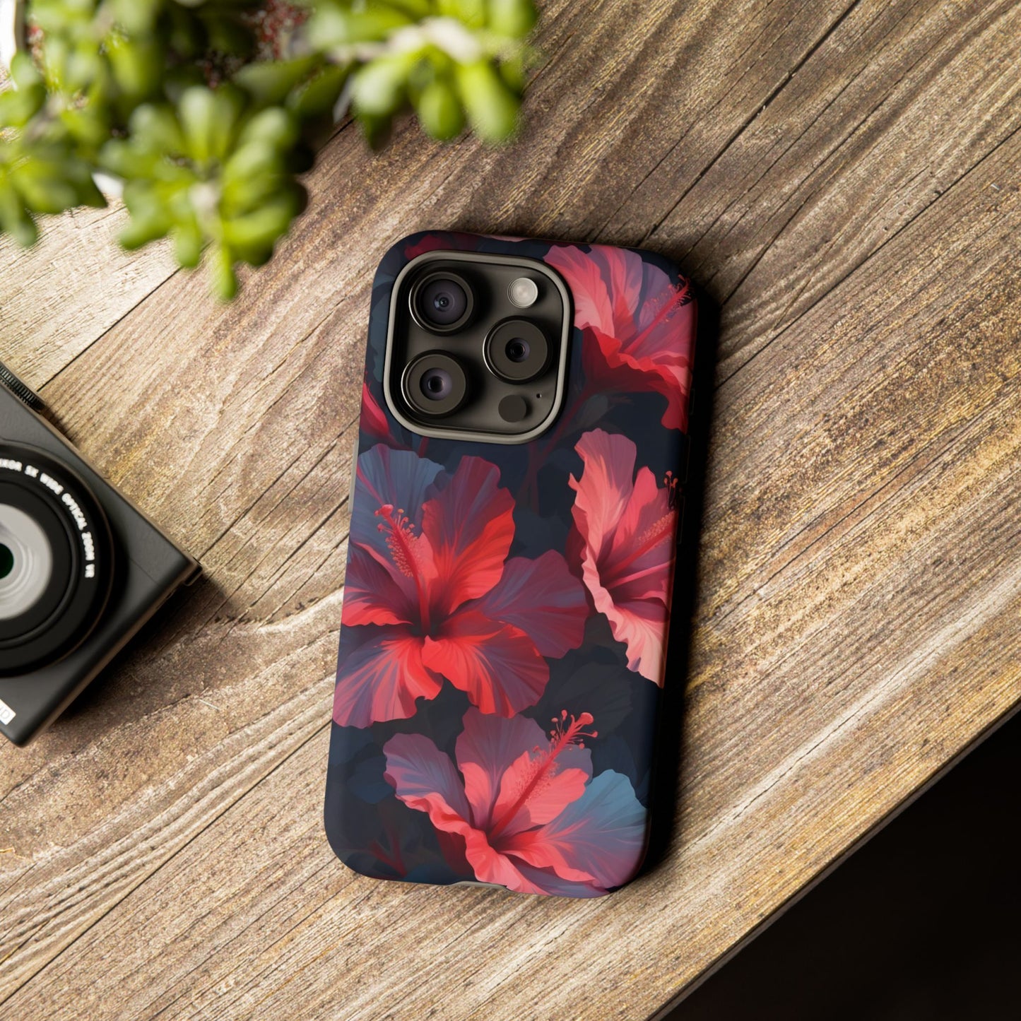 Vibrant red and pink hibiscus flowers blooming against a dark background| Floral phone case design