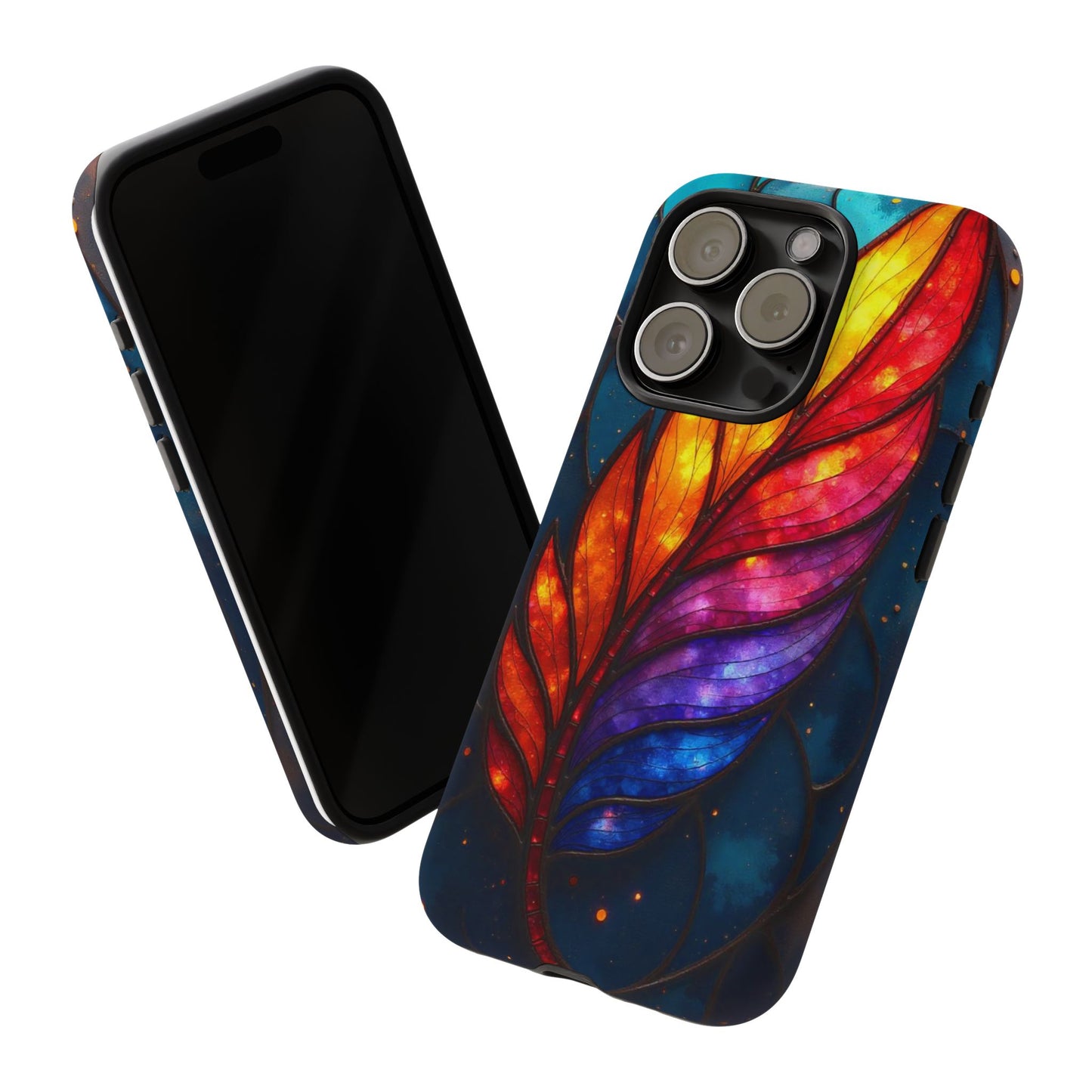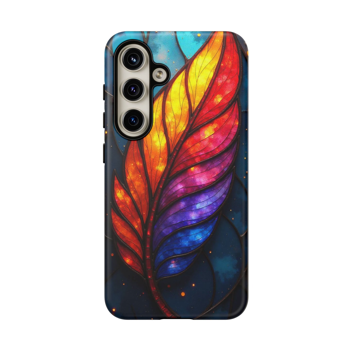 A striking stained glass design featuring a colorful abstract feather in vibrant red, orange, yellow, purple, and blue hues. Set against a dark background, it’s a bold and artistic choice for your mobile case.